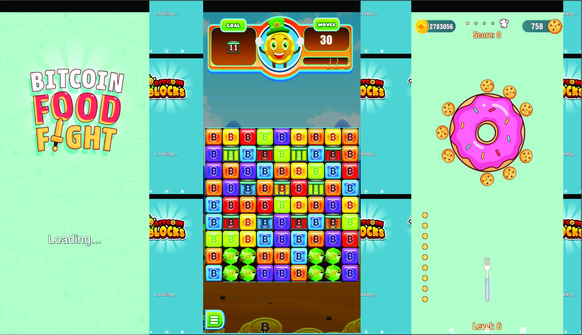 Então o que o Bitcoin Blocks e Bitcoin Food, é um jogo de bolhas e um jogo de quebrar Roscas, e Pizza e Melancias e etc. Onde você precisa estourar bolhas coloridas para removê-las da grade. E Food, você precisar quebrar as roscas com galfos.